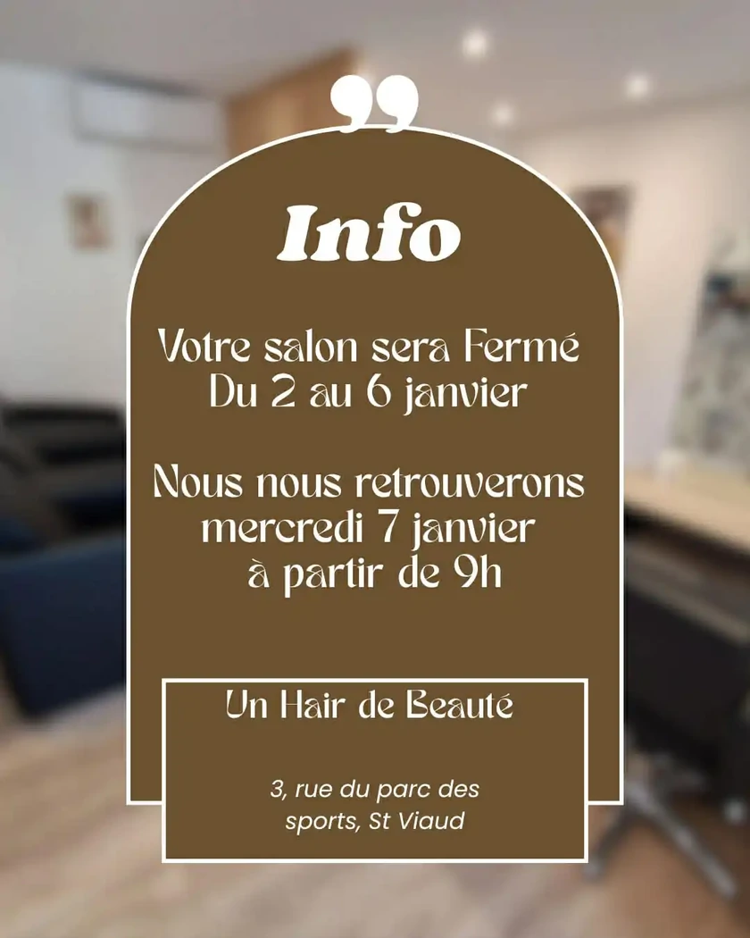 Bienvenue chez Un Hair de Beauté, notre salon de coiffure à Saint-Viaud. Nous ? C’est Audrey et Manon ! Nous vous accueillons avec simplicité, convivialité et bienveillance, pour prendre soin de vos cheveux… et de vous. Que vous souhaitiez changer de coupe, illuminer votre couleur ou simplement profiter d’un moment de détente, nous sommes là pour vous écouter et vous conseiller. Dans une ambiance chaleureuse et bienveillante, nous mettons notre savoir-faire au service de vos envies, pour le quotidien comme pour les grandes occasions. Chez Un Hair de Beauté, nous croyons que la coiffure est avant tout une rencontre, un échange et un instant de bien-être partagé.